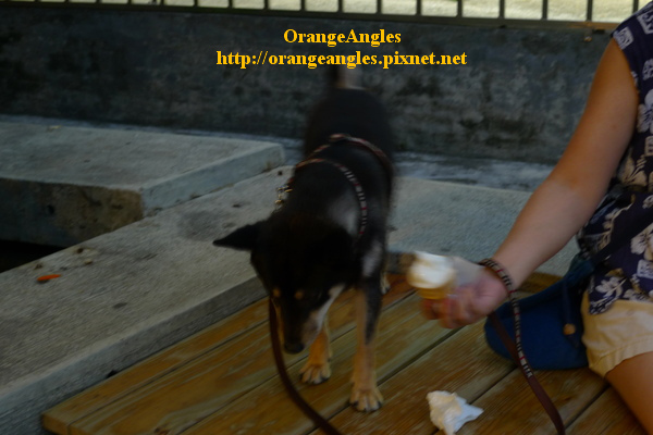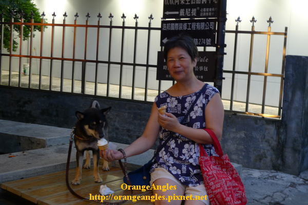 在路上看到一個溫馨的景象。一隻可愛的黑色小柴犬,吃著女主人給的冰淇淋,主人一支,牠也一支;一人一犬,吃的不亦樂乎。忍不住走上前去,取得主人同意後,拍攝下這難得的畫面。一股勁享受冰涼滋味的牠,突然看到眼前閃個不停的相機,居然害羞地捨棄冰淇淋且低下頭,顯得相當靦腆呢!